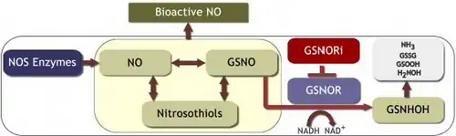 The enzyme GSNO reductase (GSNOR) reduces S-nitrosoglutathione (GSNO) to an unstable intermediate, S-hydroxylaminoglutathione, which then rearranges to form glutathione sulfonamide, or in the presence of GSH, forms oxidized glutathione (GSSG) and hydroxylamine.[3][4][5] Through this catabolic process, GSNOR regulates the cellular concentrations of GSNO and plays a central role in regulating the levels of endogenous S-nitrosothiols and controlling protein S-nitrosylation-based signaling.