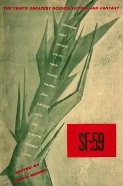 SF '59: The Year's Greatest Science Fiction and Fantasy is a 1959 anthology of science fiction and fantasy short stories and articles edited by Judith Merril. It was published by Gnome Press in an edition of 5,000 copies, some of which were never bound. It was the fourth in a series of 12 annual anthologies edited by Merrill. Most of the stories and articles originally appeared in the magazines Fantasy and Science Fiction, Astounding, Playboy, The Saturday Evening Post, If, Galaxy Science Fiction, Nebula, Science-Fantasy, Fantastic Universe, Venture, Lilliput, The New Yorker and Future.
