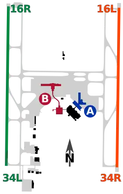 • 17R/35L: 8,598 ft × 150 ft (2,621 m × 46 m), concrete[42]