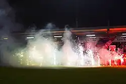 As a reaction to the transformation of the club by the new owner, supporters founded the Violet-White initiative, whose initial aim was to preserve the club's violet and white tradition. They acted on several levels: On the one hand, negotiations were held with club officials, on the other hand, actions such as the peaceful invasion and occupation of the pitch during a friendly match were carried out.