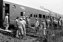 The train, driven by Antonio Gore, could not avoid the crash: the locomotive derailed and collapsed parallel to the tracks, following its route for hundreds of meters until two passenger cars in the center of the train embedded themselves into the ground. As a result, many passengers were struck in the cars. Those who suffered minor injuries could escape by jumping out of the windows, but many others could not be rescued until special machines and tools to cut the coaches open arrived from nearby cities.[1]