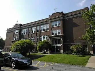The parish school was established in 1859 in a frame building that was first used as the parish rectory.[3] This building was enlarged for more classroom space and for living quarters for the Sisters of Charity of the Blessed Virgin Mary who began teaching in the school in 1861. In the school's early years there was usually a layman who taught the older boys in addition to the Sisters. Among them was M.V. Gannon who would go on to become an attorney of some merit.[35] A new brick school building was built between 1870 and 1871.