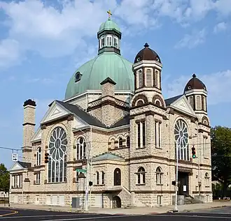 Designed by Charles Insco Williams, Sacred Heart is a limestone building with a limestone foundation, an asphalt roof, and various elements of sandstone and copper;[4] the limestone was quarried locally, while the sandstone was obtained from Berea, Ohio. Constructed in the Romanesque Revival style,[2]: 360 but with a prominent octagonal Baroque dome and glazed cupola, towers flank the main entrance, and there are rose windows under the pediments of the front and side.[4] When constructed, the building featured a basement under the 75-foot ceiling, and its general plan was 115 by 92 feet, or 23, 35, and 28m respectively.[2]: 360 Grand woodworking, artwork, and chandeliers once filled the interior, but most have been removed; some were destroyed by the raging waters of the Great Flood of 1913, while others were intentionally removed or painted over at later dates.[3]
