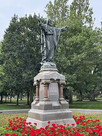 The statue represents the Sacred Heart of Jesus. It was sculpted by Robert Cassiani and dedicated during the 1893 commencement exercises. it represents Jesus and the inscription translates to "Come to me everyone". It was modeled after the statue of the Sacred Heart by Gabriel Thomas, which stood at the Montmartre basilica until 1900.[2] It faces the lady on the golden dome. It underwent restoration in 2013.[3]