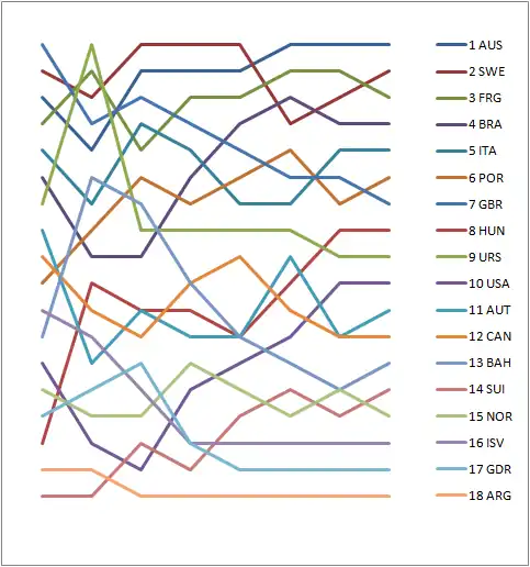 | Rank | Country | Helmsman | Crew | Race 1 | Race 2 | Race 3 | Race 4 | Race 5 | Race 6 | Race 7 | Total | Total – discard | |||||||