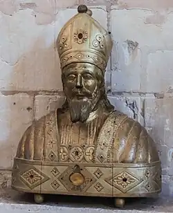 A reliquary-bust of Saint Martin stands on a secondary altar in the south arm of the transept. Made of gilded wood and adorned with artificial stones, it consists of three assembled parts and probably dates from the late 19th century. It depicts Saint Martin wearing a coif and miter.[41]