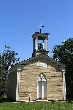 The church is a small wooden structure on a limestone foundation.[2] The general form of the building is Greek Revival, seen in the low-pitched roof and the cornice returns. But smaller elements are Gothic Revival: the pointed arches on the door and windows and in the corner pilasters, the pointed corbeling under the raking cornice. The walls are clad in 9-inch wood planks grooved to look like stone blocks. The exterior was never painted. On top is a spare bell tower styled like the rest of the church, topped with a small cross.[5]