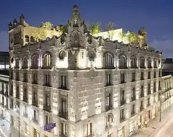 In the mid 1930s the roof of the building was adapted as a terrace in order to house a rooftop restaurant. At that time the Art Deco style was popular in Mexico City, and its influence can be appreciated in some details of the terrace like the geometrized battlements and the two small domes.