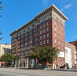 St. Francis High School was founded in downtown Louisville, Kentucky, in 1976, by Tom Pike, a group of parents and board members.[2] Pike, who would be headmaster until he retired, had been Acting Head of School at St. Francis School in Goshen. St. Francis at that time included kindergarten through ninth grade; with this change, it became K–8, and the rising 9th grade migrated to the new high school. The founders chose a site downtown in order to give their adolescent students easy access to cultural institutions and resources such as the main branch of the Louisville Free Public Library and close proximity to the adult world they would soon be joining.[3] St. Francis opened in September 1977 with 60 students and 14 teachers and staff.[4] The school was housed in the historic former Downtown YMCA building at 233 W. Broadway, a 1913 structure in the Beaux Arts style listed in the National Register of Historic Places.[5][6] Originally occupying the building's third floor, the school shared athletic facilities with the Downtown Athletic Club, including the former YMCA's pool, squash court, and indoor track, and basement theater. By 1981, the school had grown to 123 students and 18 teachers, and no longer fit on the third floor. When Holly Wiedemann, a Lexington-based developer who focused on adaptive reuse of historic structures, renovated the building as a mixed-facility incorporating residential, retail, and office space, the school moved the main lobby and offices to the basement level in order to expand classroom space on the 3rd floor.[7]