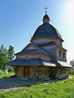 In 1947–1989, the church was closed by the Soviet authorities. In 2009–2014, the church was restored with wood shingles (designed by architect Serhii Pinkovskyi, and was renovated by I. Bukhanskyi).[6] Next to the wooden church, a stone church of the Archangel Michael was built in the early 1990s and consecrated in 1995 (architects Sviatoslav Krupchuk and Roman Hoshko).[2][3]