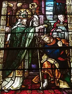 Subjects of stained glass windows as arranged from east to west North Side South Side Apse Saint Dominic receiving the Rosary from the Virgin Mary Saint Patrick explaining the Trinity Nave The Last Supper The Presentation of Jesus at the Temple The Annunciation The Resurrection of Jesus Sacred Heart of Jesus appearing to St. Margaret Mary Death of Saint Joseph The Marriage at Cana The Anointing of Jesus Saint Patrick's baptism of the High King of Ireland Jesus on a crucifix speaking to Saint Thomas Aquinas non-pictorial window over a door Saints Vincent de Paul and Anthony of Padua