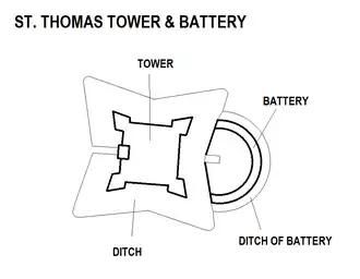 | Map of St. Thomas Tower and its battery | |