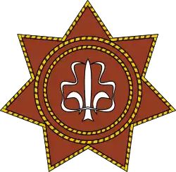 The fleur-de-lis in the membership badge of Sak'art'velos Skauturi Modzraobis Organizatsia is made of the initials of the organization S-S-M-O in the Georgian alphabet.