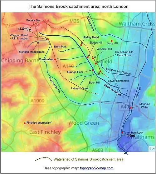 17. ^ Elsewhere, the railway line between Enfield Chase and Grange Park stations crosses from the east side of the watershed between Salmons Brook and Saddlers Mill Stream to the west side at a col at an altitude of about 40 metres, just behind Old Park Grove. Windmill Hill lies to the north of this col at c60 metres altitude, Bush Hill lies to the south at c50 metres, and the two watercourses on either side are at about 30 metres. This topographical configuration invites speculation that the col is also a wind gap, in this case marking a former line of Salmons Brook, when it may once have flowed eastwards to the Lea across this "wind gap" and then along today's line of Saddlers Mill Stream. The brook would later have been diverted to its present course by stream capture. However, in this case the col could equally have come about through other causes, such as spring sapping on one or both sides. So the stream capture hypothesis currently remains in the realm of speculation only.