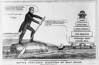 - In the pro-Whig cartoon Matty's perilous situation up Salt River, Martin van Buren is depicted neck deep in Salt River with weighted boxes of 'Tariff', 'Hooe's Trial', 'Negro Suffrage', 'Sub Treasury', and 'Standing Army of 200,000 men', as well as a crown atop these boxes. Whig candidate William Henry Harrison paddles towards him and watches as he struggles to stay afloat on Salt River.[10]