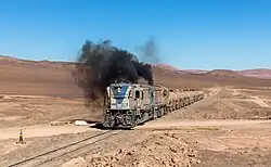 The Salta–Antofagasta railway, also named Huaytiquina,[2] is a non-electrified single track railway line that links Argentina and Chile passing through the Andes. It is a 1,000 mm (3 ft 3+3⁄8 in) metre gauge railway with a total length of 941 km (571 in Argentina[3] and 330 in Chile), connecting the city of Salta (Argentina) to the one of Antofagasta (Chile), on the Pacific Ocean, passing through the Puna de Atacama and Atacama Desert.