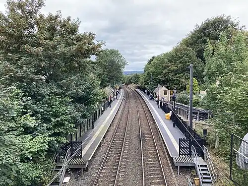 The original station was opened in May 1856 by the Midland Railway, which had absorbed the Leeds and Bradford Extension Railway between Shipley and Colne in 1851. It closed on 20 March 1965 following the Beeching Axe, but West Yorkshire Passenger Transport Executive and British Rail reopened it on 9 April 1984, at a cost of £139,000 (equivalent to £564,300 in 2023).[1][2] The current station has wooden platforms and waiting shelters (though these are stone-built rather than the metal and plexiglass designs used elsewhere). Its predecessor was of more substantial stone construction, with buildings on each platform; these were demolished in 1970, five years after the station closed.[3]
