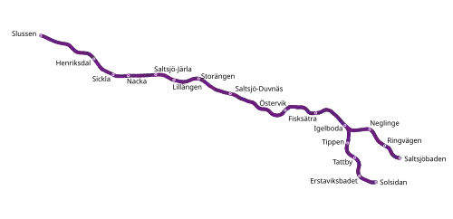 The main line runs from Slussen to Saltsjöbaden, while a branch line connects the intermediate station Igelboda to Solsidan. There is a rail replacement bus line 25B connecting Slussen and Henriksdal while the reconstruction of Slussen is in progress.