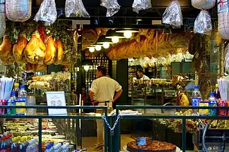 A salumeria is a food purveyor and retail store that produces and sells salumi, which are meat products of Italian origin that includes sausages, cold cuts and other foods predominantly made from pork.[1][2] Some salumerie also produce some beef-based products, such as bresaola, a salted beef product, and purvey other food products such as pasta, cheese, preserved foods, anchovies, salt cod, wines, bread and cooked meats.[2][3][4] Some modern salumerie only sell salumi and related products, while not producing products on-premises. Some salumerie also operate sit-down restaurants, such as Sorriso Italian Salumeria in Queens, New York City.[5] Salumeria Biellese is another salumeria in New York City that is well-known, and was established in 1925.[6]