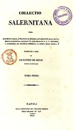 • Collectio Salernitana ossia Documenti inediti e trattati di medicina appartenenti alla scuola medica salernitana raccolti e illustrati da G. E. T. Henschel, C. Daremberg e S. De Renzi; premessa la storia della scuola e pubblicati a cura di S. De Renzi medico napolitano, Sebezio, Naples 1852