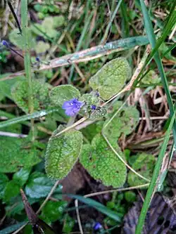 Salvia palifolia is a decumbent perennial herb native to Colombia and western Venezuela, growing in grassland, cloud forest clearings, streamsides, and rocky outcrops from 1,600 to 3,500 m (5,200 to 11,500 ft) elevation. The 3 to 4 cm (1.2 to 1.6 in) long green leaves are hastate or cordate; the blue flowers are 5 to 6 mm (0.20 to 0.24 in) long.[1]