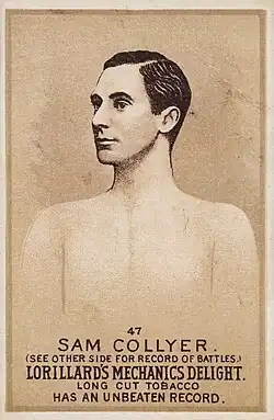 Sam Collyer was the trainer for, and seconded Billy Walker in a prize fight verses Jimmy Weedon on August 31, 1876, in Pennsville, NJ. In round 76, Weedon knocked out Walker, who did not get back up. Collyer threw up the sponge to end the fight. Walker would die later that night from his injuries.[21] Weedon, Collyer and a number of other men involved in the fight were arrested,[22] tried and convicted. Collyer, Weedon and the others were sentenced to six years in prison for manslaughter.[23] Weedon died a year later in prison.[24] Collyer was pardoned and released two years later.[25]