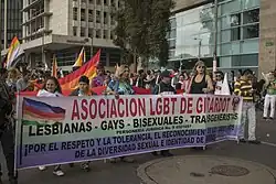 On 15 June 2007, the Chamber of Representatives approved a historic same-sex union bill by a vote of 62–43,[13] and President Álvaro Uribe was expected to sign the measure into law, which had been approved by the Colombian Senate in April. However, on 19 June, a group of conservative senators broke party discipline in what is usually a routine vote on the final form of a bill and defeated the measure by 29–34 in the 102-member Senate. About 80 LGBT advocates held a demonstration outside the National Capitol the following day, protesting the bill's defeat.[14] Supporters vowed to revive the legislation. The bill, which had been endorsed by conservative President Uribe,[15] would have made Colombia the first nation in Latin America to grant same-sex couples in long-term relationships the same rights to health insurance, inheritance and social security as married couples.