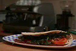 Local savoury dishes include fagioli con le cotiche, a Christmas bean and bacon soup; pasta e ceci, a chickpea and noodle soup with garlic and rosemary; nidi di rondine, a baked pasta dish with smoked ham, beef, cheese, and a tomato sauce; and roast rabbit with fennel.[1][4][5] Erbazzone is a spinach-based dish that includes cheese and onions.[4] There is a dish found mostly in Borgo Maggiore called piada, which consists of flatbread with various fillings and is somewhat similar to the piadina from Emilia-Romagna.