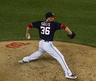 The Washington Nationals selected Solís in the second round, with the 51st overall selection of the 2010 MLB Draft,[4] and Solís received a $1 million signing bonus to sign with Washington.[8] Pitching for the Scottsdale Scorpions of the Arizona Fall League (AFL) after the 2010 regular season, Solís won the AFL championship. He again pitched in the AFL after the 2011 regular season, when he damaged the ulnar collateral ligament (UCL) in his elbow.[9] Before the 2012 season, MLB.com rated Solís as the 86th-best prospect in baseball.[10] He had Tommy John surgery to repair the UCL in March 2012 and missed the 2012 season.[9] He returned to Potomac in 2013,[11] and was assigned to the AFL after the 2013 season.[9]