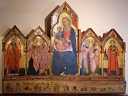 Of the altarpieces now on display are a St Facondino in prayer by Giuseppe Reposati. The former main altarpiece was a 15th-century polyptych depicting an Enthroned Madonna and Child, surrounded by angels, saints and apostles by the Master of Fossato, now on display in the Pinacoteca Civica of Rocca Flea. A codex depicting the life of San Facondino attributed to the same master is now in the Vatican Library.[1]