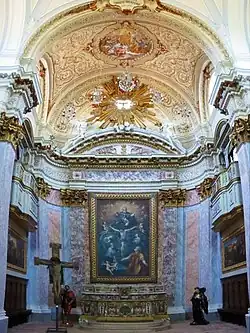 The presbytery has 18th-century wooden choir stalls. The lateral altars have polychrome scagliola or faux marble, with 18th-century altarpieces depicting: Christ in Glory with Saints Anthony Abbot, Ignatius of Loyola, Clement, Francis de Sales and Francis Borgia and St Carlo Borromeo giving Communion to Saint Aloysius Gonzaga, both painted by Pasquale Ciaramponi. Niches in the walls hold statues depicting the Doctors of the Church and the Evangelists by Gioacchino Varlè.[1]