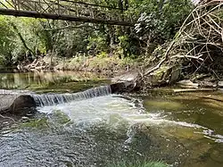 The Lagunita Diversion dam was the most significant barrier to fish passage, because it was located on the mainstem San Francisquito Creek, blocking upstream salmonid migration to all San Francisquito Creek tributaries in lower rainfall years. It was located just north of the east end of Happy Hollow Lane near Alpine Road and near the Stanford Weekend Acres neighborhood in unincorporated Menlo Park. This dam was originally constructed in 1899–1900 to divert winter flows to fill Stanford's Lake Lagunita.[31] It is located 1⁄3 mile (0.54 km) downstream of the mouth of Los Trancos Creek but stopped diverting water to fill the artificial lake when the San Francisquito Creek Pump Station (2⁄3 mile (1.1 km) further downstream) took over this task in 1998.[36] A fish ladder was constructed on the Lake Lagunita Diversion Dam in 1954, however despite re-modification it remained impassable in low rainfall years. In 2014 Our Children's Earth Foundation sued Stanford for allegedly violating the Endangered Species Act, saying the dams obstruct steelhead trout from swimming upstream to freshwater habitats necessary in the early stages of their life cycle. They also registered concern about the Jasper Ridge Road Crossing as another barrier to fish passage. The Jasper Ridge Road Crossing was a concrete weir (low dam) built along a dirt road that crosses San Francisquito Creek shortly downstream from the confluence of Corte Madera and Bear Creeks. The Jasper Ridge Road Crossing blocked the passage of steelhead upstream and downstream during lower flow conditions that begin in the spring and prevent smolt outmigration in late spring, as well as immigration of spawning adults in dry winters. In 2015 Stanford denied that the court had ordered them to remove the Lagunitas Diversion Dam and maintained that it had been planning to remove that dam since its 2010 Habitat Conservation Plan and had initiated the engineering and hydrology work to prepare for removal.[37] In December 2017 Stanford received a $1.2 million ecosystem and watershed restoration grant from the California Department of Fish and Wildlife which covered 30% of the costs of dam removal and riparian restoration. By late 2018 Stanford removed the 119-year-old Lagunita Diversion Dam and restored 480 feet (150 m) of the creek, improving fish passage with pools, shallows and native plants, and moved the creek eastwards away from the residential area.[38] In addition, Stanford replaced the Jasper Ridge Road Crossing weir with a bridge, opening 6.6 miles (10.6 km) of unimpeded access to the Bear Creek mainstem, and its tributaries such as West Union Creek, to salmonid spawning runs.