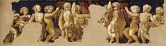 The design included since the beginning a thoroughly painted decoration of the interior, and a contract had been signed with the young Correggio, who had already worked in another Benedictine monastery, in the Camera della Badessa of San Paolo. Correggio added a painted frieze which runs for the whole internal perimeter.[3] It is long strip with monochrome paintings (with few red details) on a dark blue background, including also some tondoes with portraits of Benedictine popes, cardinals and monks. The main feature is a series of puttos in actions symbolizing the importance of the Christian Mass and sacrifice. The grotesque decorations on the semi-piers and the vault decoration (with candelabra, puttos and symbols of St. John the Evangelist) were contributed (c. 1520) by Correggio's pupils, in particular Michelangelo Anselmi .