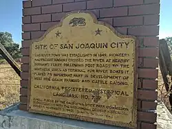 San Joaquin City was a river town established in 1849, on high ground by the San Joaquin River. Pioneers and freight wagons following post roads to the Southern Mines crossed the San Joaquin River nearby at Durham's Ferry, and as the crossroads point for riverboat and overland traffic, the town played an important part in development of the west side of San Joaquin Valley grain farming and cattle raising. It became a popular trading outpost, and was said to be a rival to nearby Stockton.[4]
