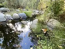 Nonetheless, the site remained an attractive destination and in the 1960s "became notorious as a hangout for hippie bathers, who were often arrested for trespassing and indecent exposure".[15] A "commune" reportedly moved in, and in addition to public nudity,[16] there were two murders and quite a bit of drug use.[10] The Orange County Sheriff's Department was summoned on a regular basis.[17] The old masonry tubs were eventually dynamited to discourage squatters,[17] and the overflow re-routed to a ditch that drained into Hot Spring Creek (a tributary of San Juan Creek).[10] During this era there were continuing but always unsuccessful efforts to add the springs to Cleveland National Forest.[18] In 1974 the county put up a barricade around the springs to reduce visitor traffic, nudity, graffiti, etc.[19]
