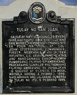 Private William W. Grayson fired the war's first shots at the corner of Sociego Street and Tomas Arguelles Street.[5] A study done by Ronnie Miravite Casalmir places the event at this corner, not at Sociego-Silencio where they erroneously have the marker.[5]