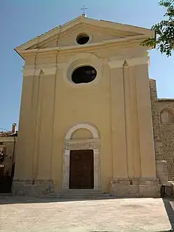 This church was dedicated to St Lawrence, and once stood outside of the town walls. During a siege in 1557, it served as a bastion of the defence. The façade has giant order pilasters with two central oculi: one above the rounded portal, and the other in the tympanum. In 1777, the interior was refurbished in a Baroque-style. The church has a single nave with two lateral chapels. The bell tower is inserted between the transept and apse. The Baroque altars demonstrate 18th-century stucco decoration. The organ was built in 1707. The Sacristy has a wooden icon of St Ubaldo upholding the city as its patron. The church has 16th-century canvases depicting respectively the Madonna del Rosary and a Visitation. There are also canvases depicting the Annunciation and a Deposition.[1]