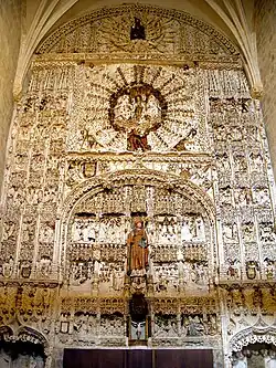 This main altarpiece was financed by the Burgos merchant Don Gonzalo Lopez de Polanco prior to his death in 1505. The work measures 15.55 by 9.04 meters and is made of a porous limestone from Hontoria de Cantera, a small town in the province of Burgos. This type of stone was often used in the construction of buildings, including the Cathedral of Burgos and the Monasteries of San Pablo but was seldom used for altarpieces.[2]