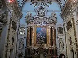 The main altar was consecrated on 16 November 1749. Above the high altar is the dove of the Holy Spirit placed in the center of a large sunburst. The altarpiece, by Gaetano Lapis, depicts the "Madonna of the Rosary and St Dominic". It was stolen during the Napoleonic period but subsequently returned. On either side of the main altar are statues of Dominican saints Catherine of Siena and Rose of Lima. On the left side of the altar, under a small canopy supported by two angels, there is a small door with a chalice in bas-relief through which the cloistered nuns receive communion.
