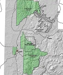 The San Pedro Parks Wilderness is located in southern Rio Arriba County in northern New Mexico and part of the Santa Fe National Forest. It is 41,132 acres (16,646 ha) (64 sq miles) in size. Elevations range from 8,300 feet (2,500 m) in the southwestern corner to 10,592 feet (3,228 m) at San Pedro Peaks near the center of the Wilderness.[1] The Wilderness's average elevation is over 10,000 ft.[2] Conifer forests, interspaced with grassy meadows, called "parks", characterize the wilderness. San Pedro Parks Wilderness is primarily visited for hiking, camping, hunting, and fishing. The Continental Divide Trail passes through the Wilderness.