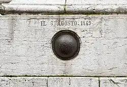 Below the left column on the facade there is a cannonball embedded in the base of the column. It derived from a bombardment in 1849 by Austrian forces in the port of Marghera, of the independent republic which had been proclaimed by Daniele Manin.