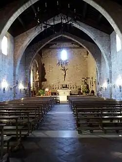 A church at the site was erected in the late 15th century and sited in the main plaza, adjacent to the City Hall. The building consists of a single nave some 40 meters long and 10 meters wide, with external buttresses. The bell tower suffered damage during an earthquake in 1755. The Chapel of the Incarnation was once located on the north side, but collapsed in that earthquake. The ceiling is made of wood. The choir is also an elevated balcony made of wood and highly painted in a Mudejar style with arabesques and designs. Some of the wooden supports have carved grotesque faces.