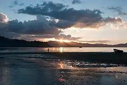 San Vicente's 14.7 kilometres (9.1 mi) of beachfront, popularly called the Long Beach, is being converted into an emerging tourist destination that will be the beneficiary of government spending on infrastructure.[6] The Long Beach have two rocky cliffs that temporarily interrupts the continuous expanse of approximately 14.7 kilometers of sugary white sand beach dividing it into three coves.[7] However, during low tide, you can walk through the sands at the bottom of the said rocky cliffs. Hence, the local government claims that it is actually continuous. It is the longest white sand beach in the Philippines and is the First Flagship Tourism Enterprise Zone of the Tourism Infrastructure and Enterprise Zone Authority (TIEZA).[8] The Long Beach spans to the coastline of four barangays namely Poblacion, New Agutaya, San Isidro and Alimanguan.[9]
