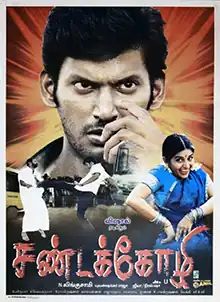 Sandakozhi (transl. Fighting Rooster) is a 2005 Indian Tamil-language action drama film directed by N. Linguswamy and produced by Vikram Krishna under G K Film Corporation. The film stars Vishal, Meera Jasmine, Rajkiran, and Lal, while Raja, Suman Setty and Ganja Karuppu play supporting roles. The music was composed by Yuvan Shankar Raja, while the cinematography and editing were handled by Jeeva-Nirav Shah and G. Sasikumar respectively.