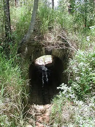 The culvert comprises a long tunnel, about 1.2 metres (3 ft 11 in) wide, beneath an unsealed roadway. It is lined on the floor and to about a third of its height along the sides with rusticated sandstone blocks. The blocks lining the floor are long and considerably narrower than those lining the side. There are two courses of blocks on each side of the culvert. The arched roof of the culvert is lined with bricks.[1]