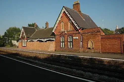 It had two platforms, both accessed by steps down from the road overbridge, the Liverpool bound platform could also be accessed from the road access to the station building.[5] There was a goods yard to the south of the lines and west of the station.[6] The goods yard was able to accommodate most types of goods including several cattle pens for livestock, it was equipped with a five-ton crane.[7]