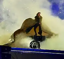 Santa performed Popcorn salé on stage at the Paris Paradis 7 festival on 16 September 2022.[10] On 14 July 2023,[11] she gave a performance in Brussels, giving a solo concert with her grand piano suspended 40 metres above the ground, as part of the opening of the inaugural Urban Garden de Plaisirs d'Été organised by the city of Brussels.[12][13][14] She joined the Enfoirés 2024 troupe where Popcorn salé was performed on stage at the Arkéa Arena in Bordeaux.[15][16] On 8 September 2024, she opened the 2024 Summer Paralympics closing ceremony at the Stade de France in front of 60,000 spectators by performing Vivre pour le Meilleur by Johnny Hallyday.[17]