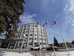 Entrance of hospital with flags of Italy, Quebec, and Canada