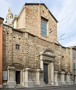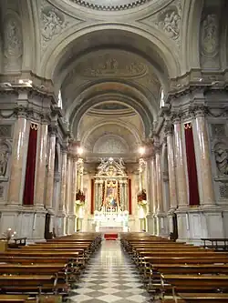 This church was commissioned by the Oratorians. The architect of the domed centralized church was Venetian architect Giorgio Massari. Construction began in 1720 and ended in 1746. The unfinished facade stands in contrast with an opulent interior that includes pink marble Corinthian columns and statues of the apostles by artist Antonio Calegari of Brescia. The nave of the church has two fresco-style paintings painted by Francesco Monti and Giovanni Zanardi.[1] The main altar is flanked by ornate musical organs.