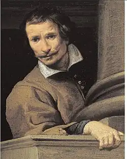 On the left, in a classical setting of ruins, is the Nativity with the Madonna holding the Child and, behind her, Joseph, the ox and the donkey. In the center of the fresco are the Three Kings in oriental dress in various poses. Surrounding the Magi is a group of people: behind them is a kind of procession that seems to continue along a mountain path. On the right are people on horses and grooms. According to tradition, one of these figures, the man with a moustache and goatee who looks directly at the viewer, is a self-portrait of Gian Giacomo Barbelli. The painting is signed.[21]